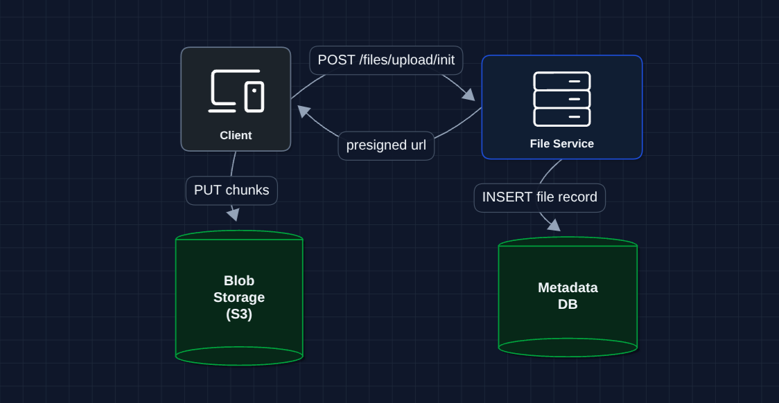 Why presigned URLs? The 50GB file never touches our application servers. The client uploads chunks directly to S3 using these time-limited URLs, reducing server load.