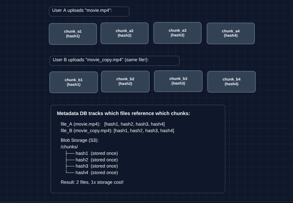 Chunks are identified by their SHA-256 hash. If two files share identical chunks, we only store them once.