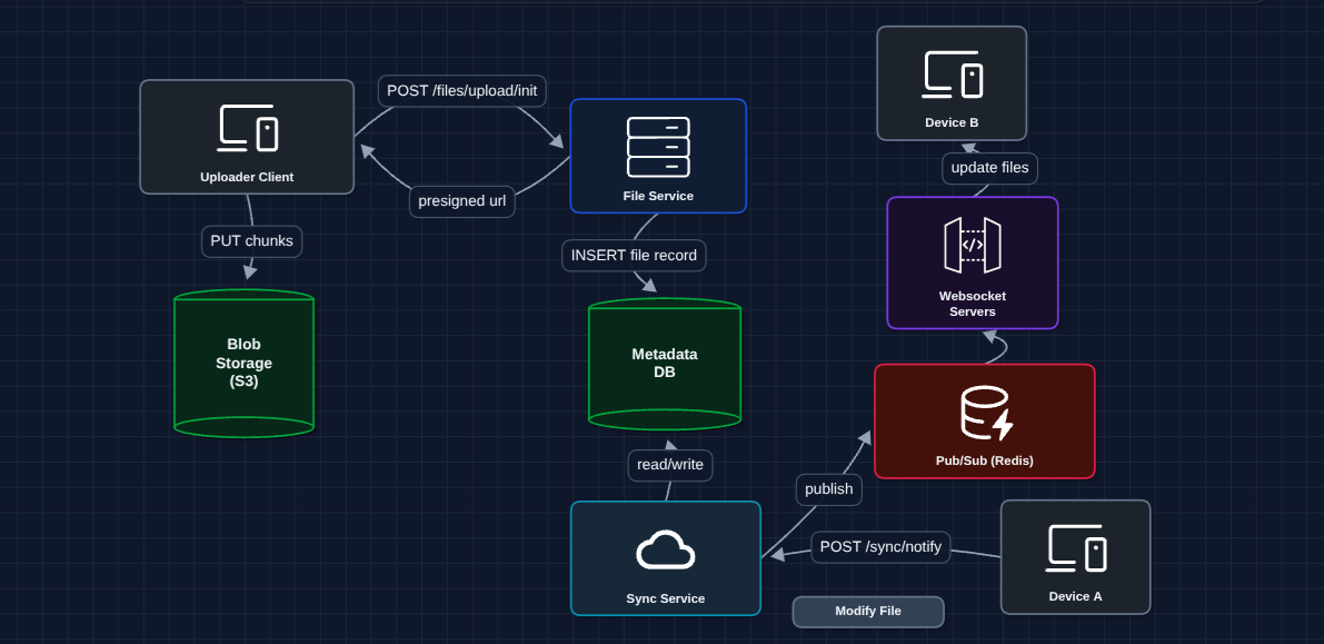 Architecturally, we need to separate the control plane (metadata, sync state) from the data plane (raw file bytes). This separation is what makes cloud storage scalable.