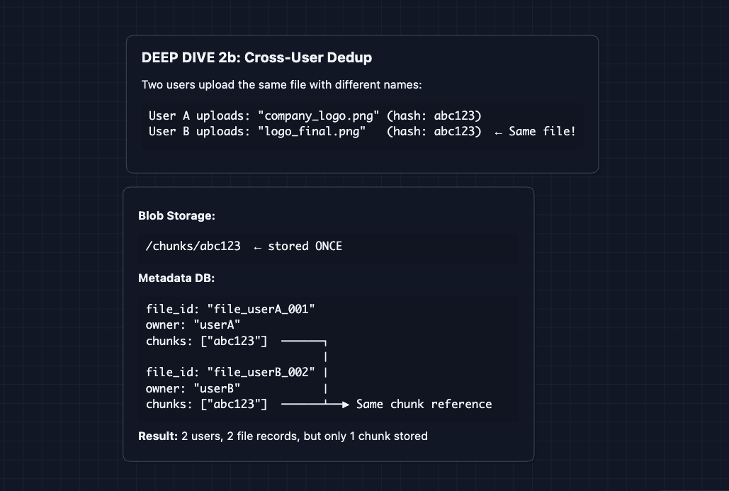 At scale, deduplication can save a lot of storage. If a million users have the same popular PDF or viral image, it's only stored once.