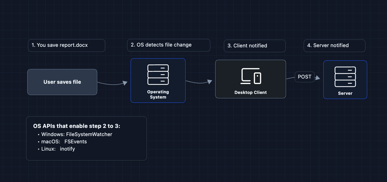 This deep dive is about the desktop client (the app running on your laptop), not the server. But it matters because the server can't sync what it doesn't know about. The client must detect and report changes first.