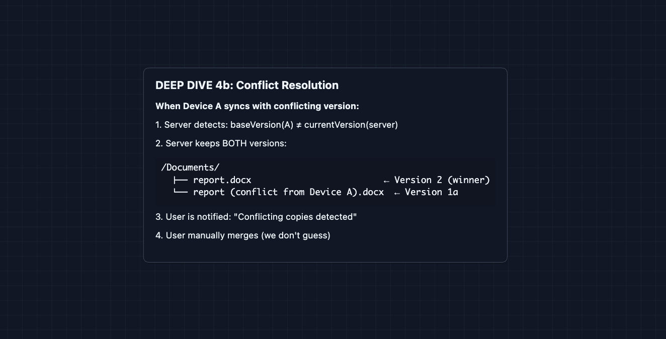 - Articulate Trade-offs: You can explain "Last-Write-Wins is simple but loses data. Alternative is conflict copies. Neither is perfect."