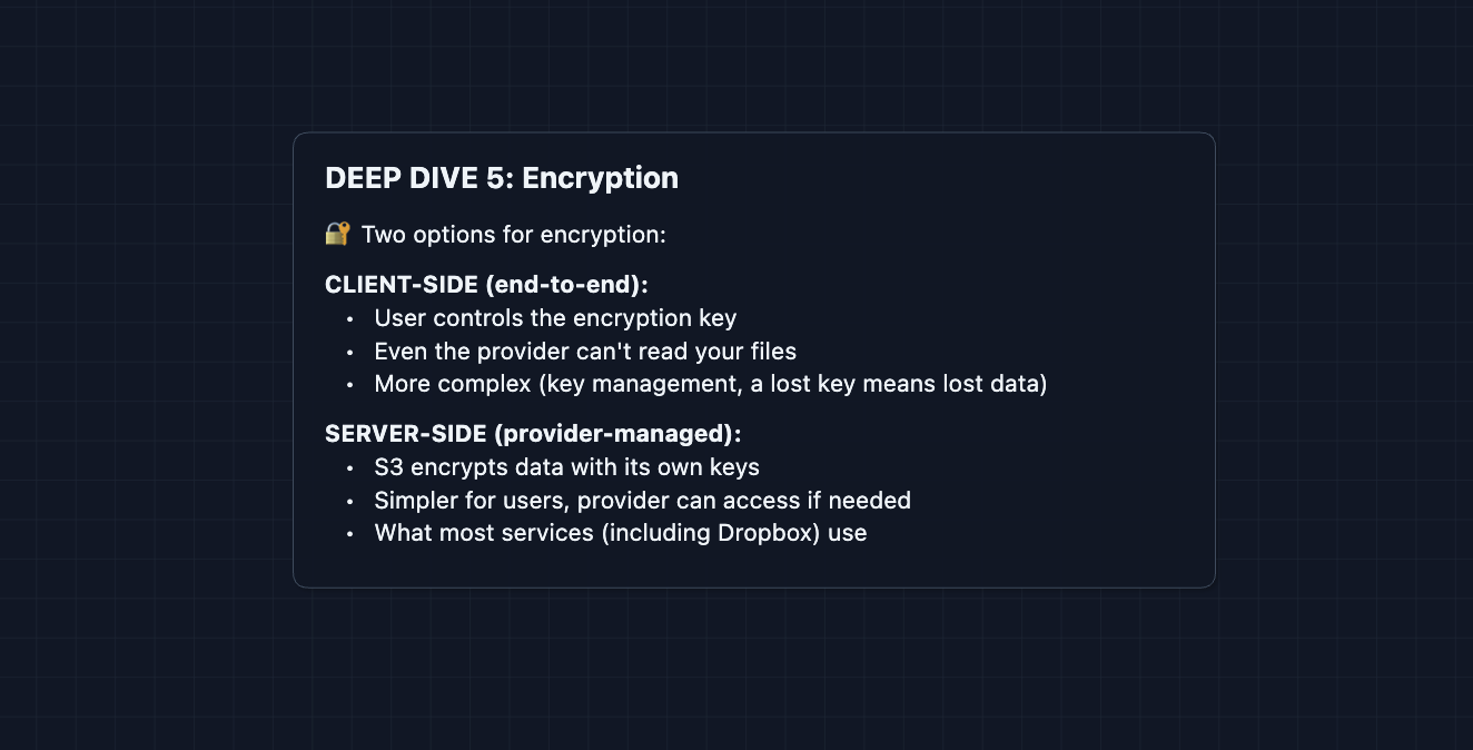 Interview note: If compression comes up, remember: compress BEFORE encrypt. Encrypted data looks random and won't compress. But most cloud storage services (Dropbox, Google Drive) don't actually compress files.