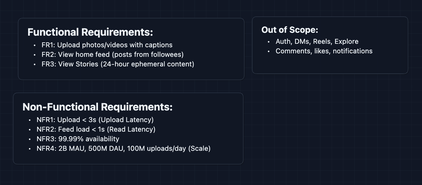 Instagram has evolved massively (Reels, Shopping, DMs), but the main product is still the feed. Let's clarify scope with the interviewer to focus on what to focus on for this interview.