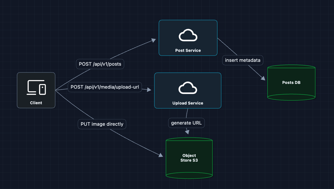Why presigned URL? The actual image (5-20MB) goes directly to S3. Our API servers never touch the bytes, saving bandwidth and CPU.