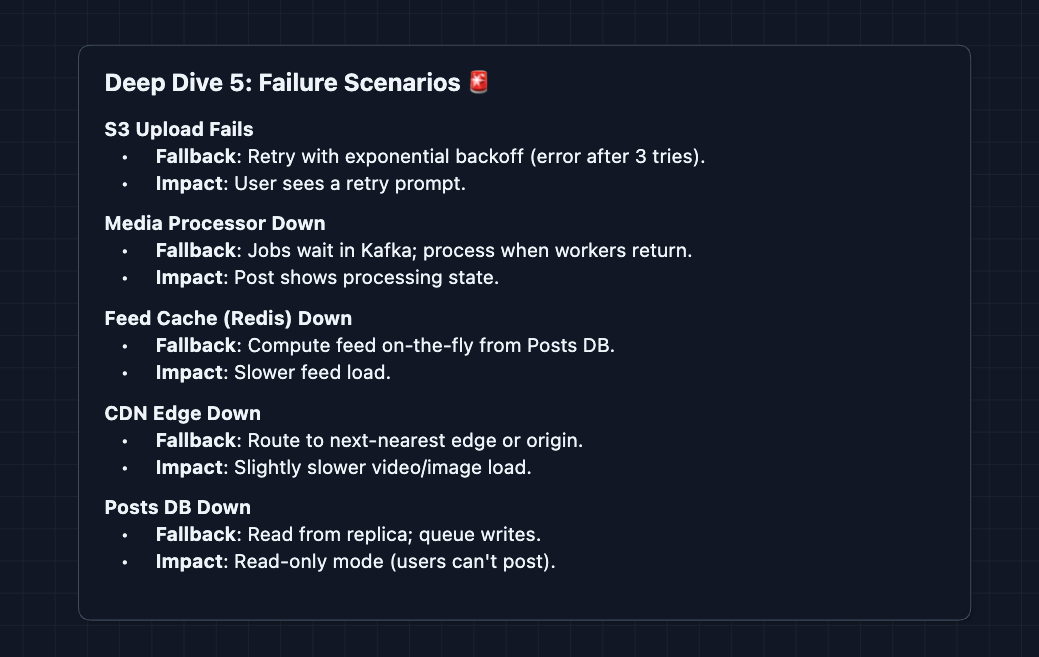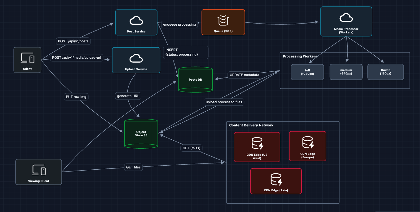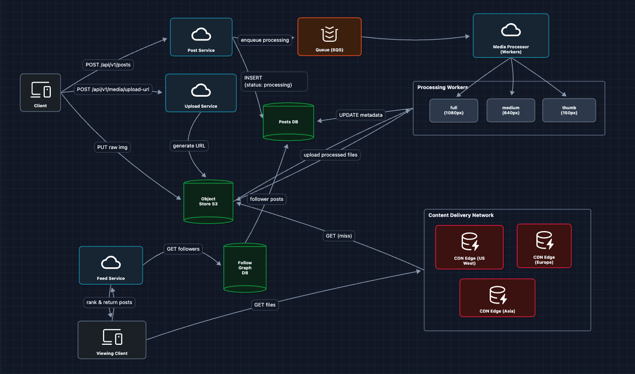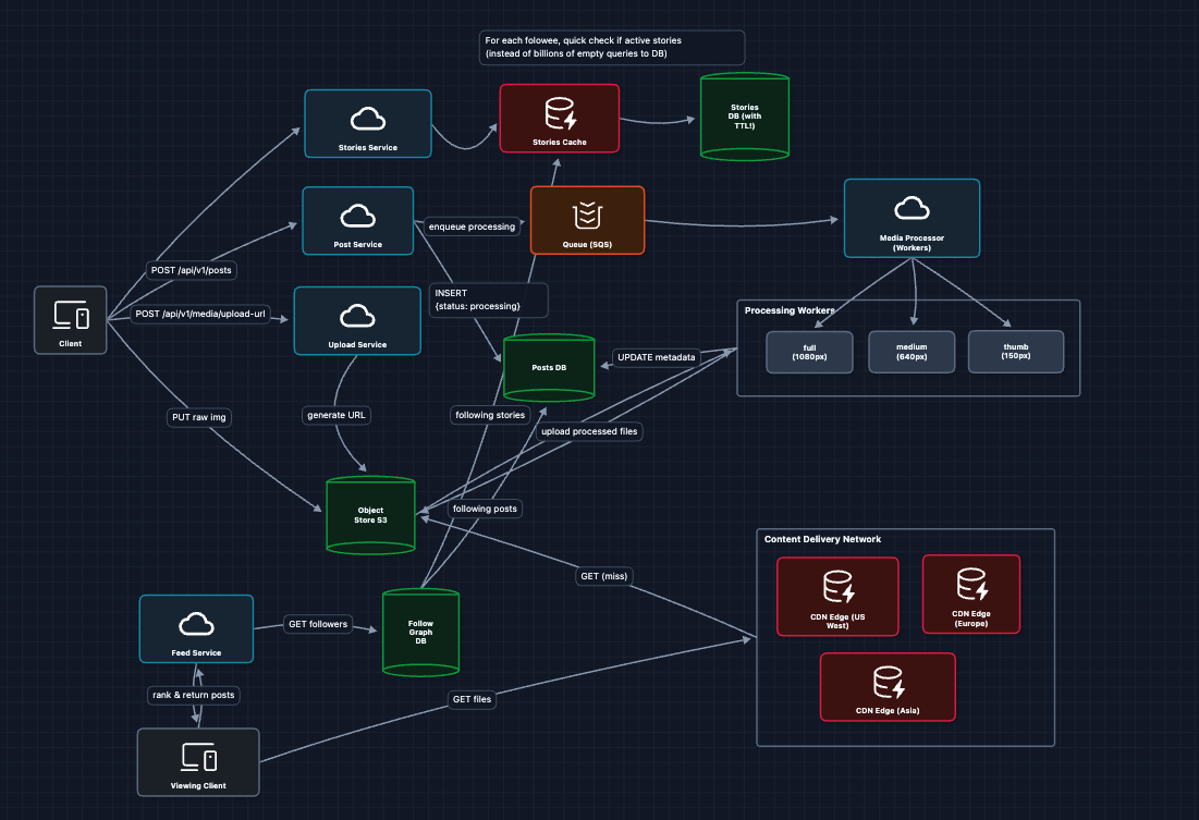 - Experience-Backed Decisions: Talk about operational concerns. How do you handle a viral post that's being viewed 1M times/minute? How do you roll out a new image format (WebP, AVIF)? How do you handle regional compliance (data residency)?