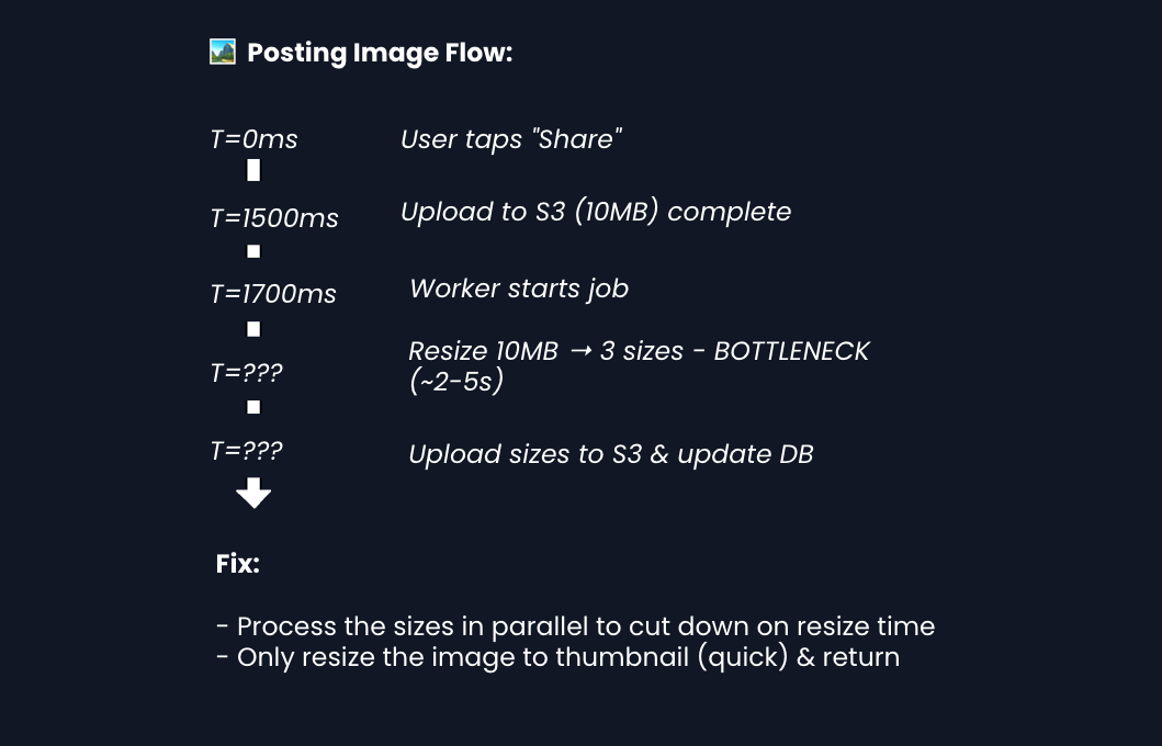 In Diagram 3, we showed async image processing. But users want to see their post instantly. Can we hit 3 seconds end-to-end?