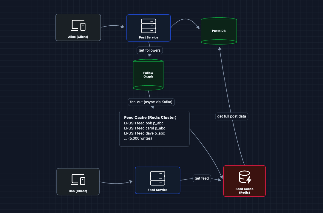 Instead of computing feeds at read time, we pre-compute them at write time for active users. When Alice posts, we push her postId to every follower's feed cache. Now when Bob opens the app, his feed is already waiting.