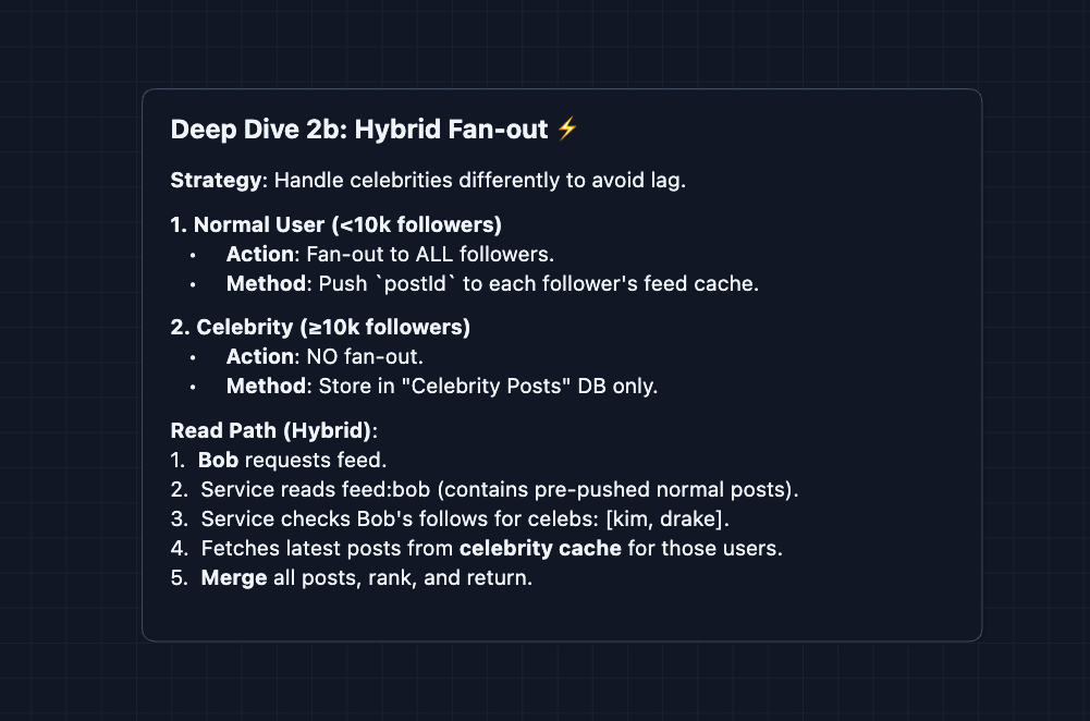 - Proactive Problem-Solving: Lead with the Celebrity Problem before the interviewer asks. Propose Hybrid Fan-out (push for normal users, pull for celebrities) and explain the trade-off math.