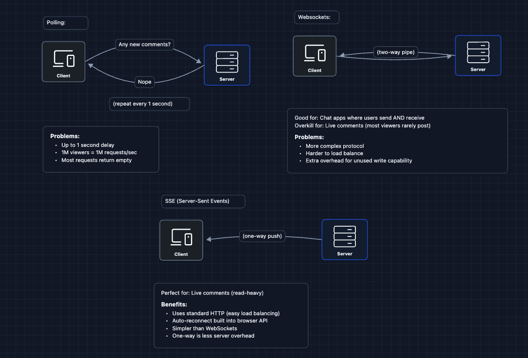Live comments are read-heavy. For every person posting, thousands are just watching. SSE is optimized for this pattern.