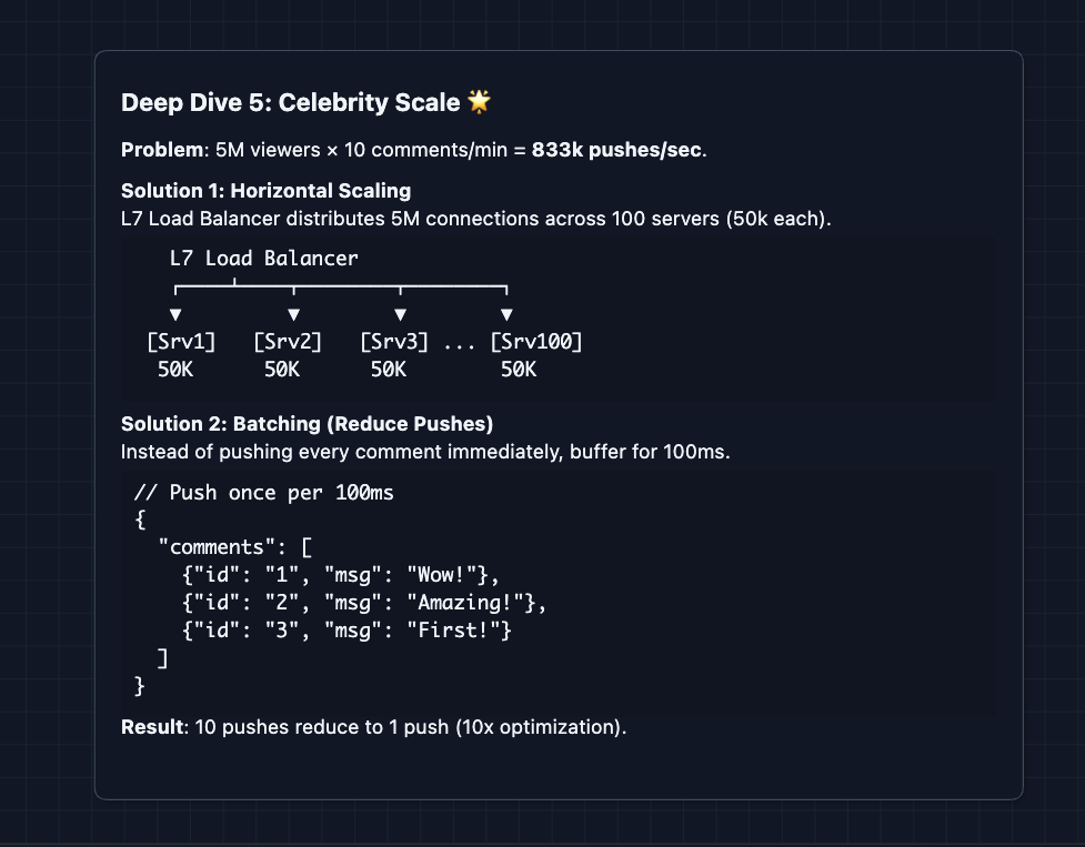 Batching trade-off: Batching adds up to 100ms latency but dramatically reduces server load. For celebrity streams where comments fly by anyway, users won't notice.