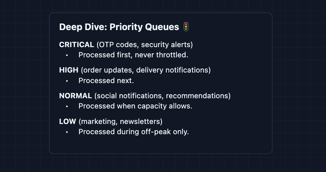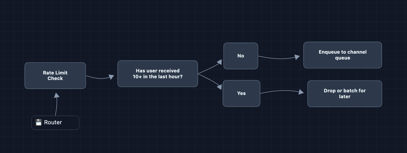 Per-user rate limiting: No user receives more than 10 notifications per hour, unless it is critical like an OTP. The router tracks counts in Redis and drops or delays excess notifications.