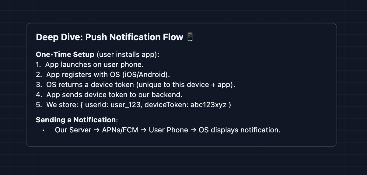 - The Bar: Address all deep dives without prompting. Discuss device token lifecycle, priority queue trade-offs, and notification batching strategies.