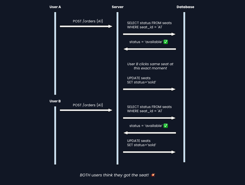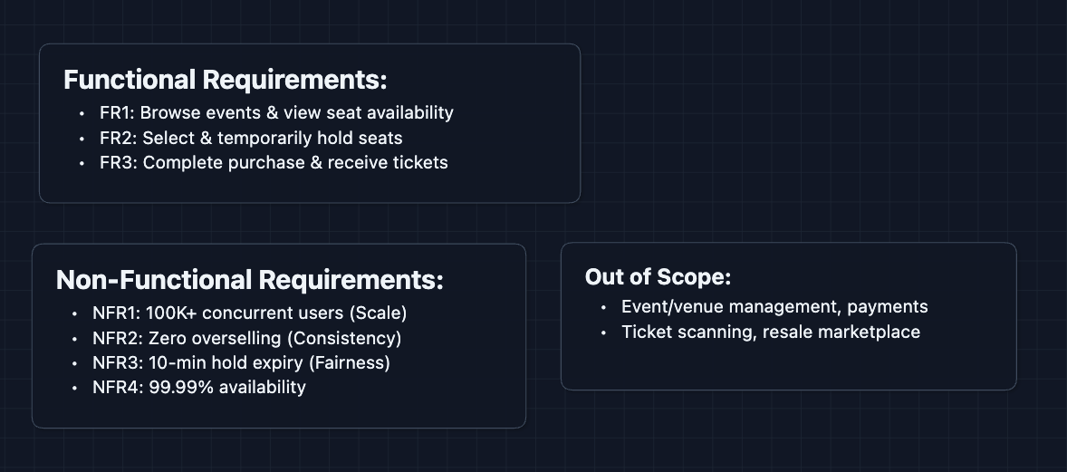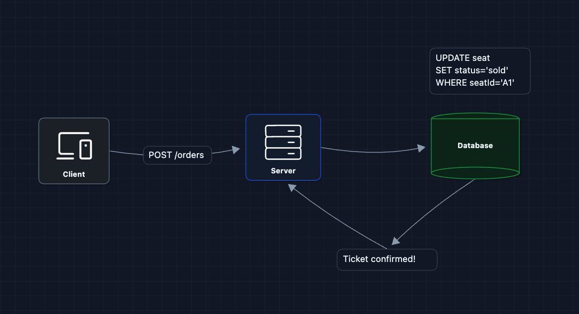 In this system, we're not serving infinite content to users. We're managing scarce, unique inventory under extreme concurrent demand. Every seat can only be sold once, and we must never oversell.