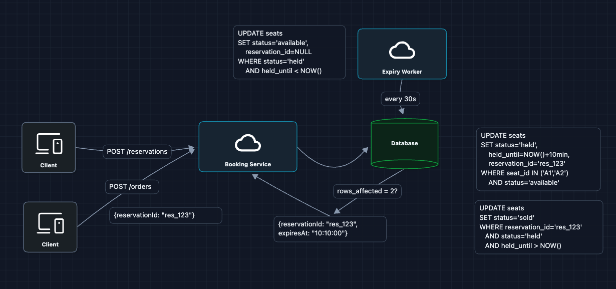 - Expect Probing: "What happens if two people click the same seat?" "Why do we need a held state?" You should explain the checkout time problem clearly.