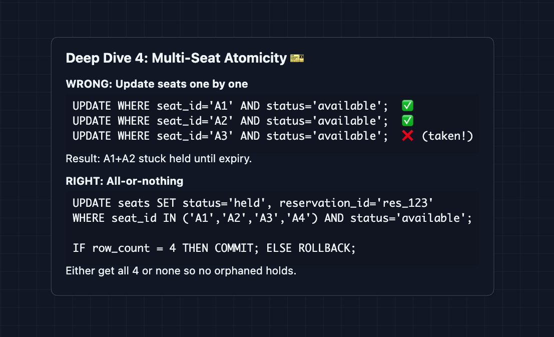 In the HLD, we showed atomic updates for a single seat. But users often want multiple seats together (a family of 4, a group of friends). This introduces a new failure mode: