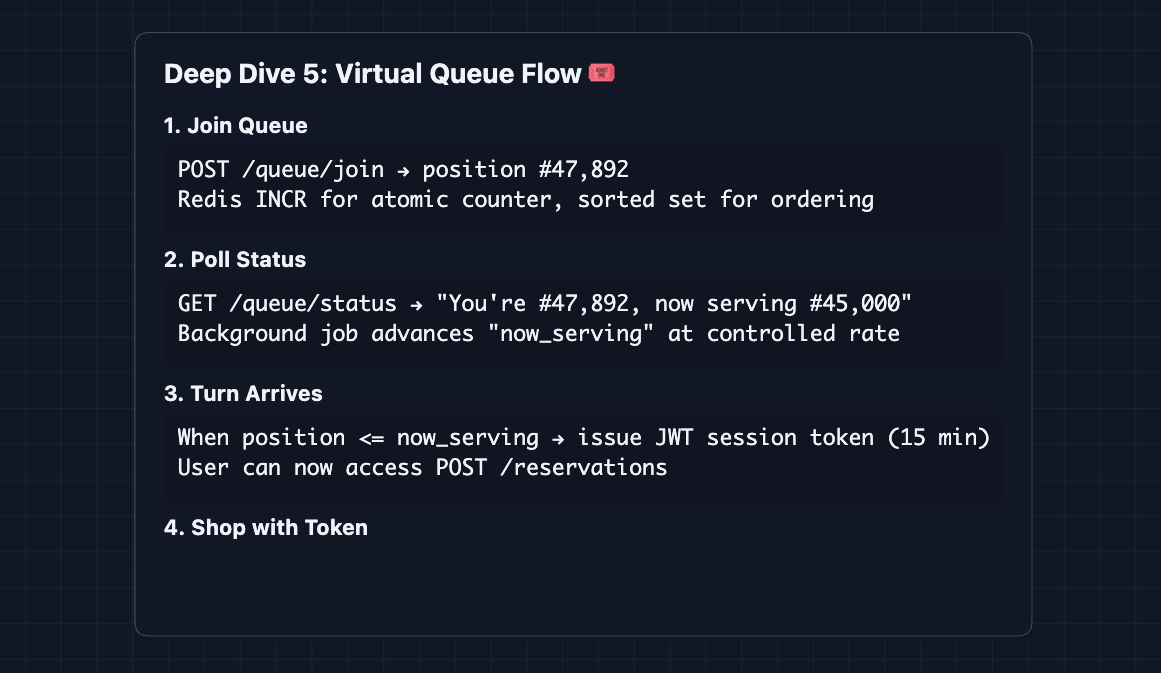 - Proactive Problem-Solving: Identify the flash sale problem before the interviewer mentions it. Bring up the virtual queue concept. Bring up multi-seat atomicity without prompting.