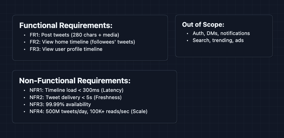 Twitter has many features, but the timeline is the heart of the product. Adjust scope with your interviewer, but we will focus on the read/write paths.