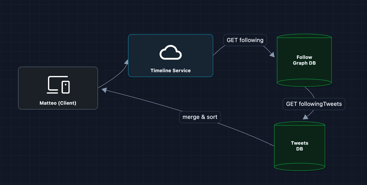 User asks for timeline, we fetch who they follow, grab all those tweets, merge, sort, return. Simple!