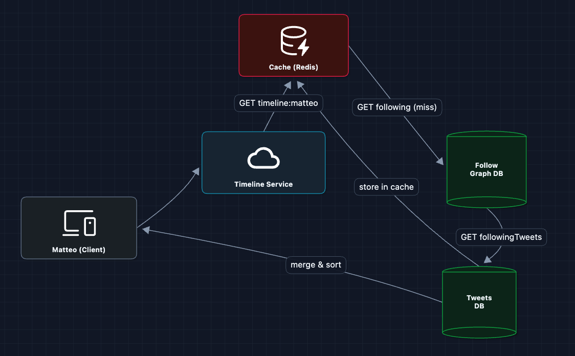 What's happening? The Timeline Service fetches pre-computed tweet IDs from the user's timeline cache, hydrates them with full tweet data, and returns paginated results.