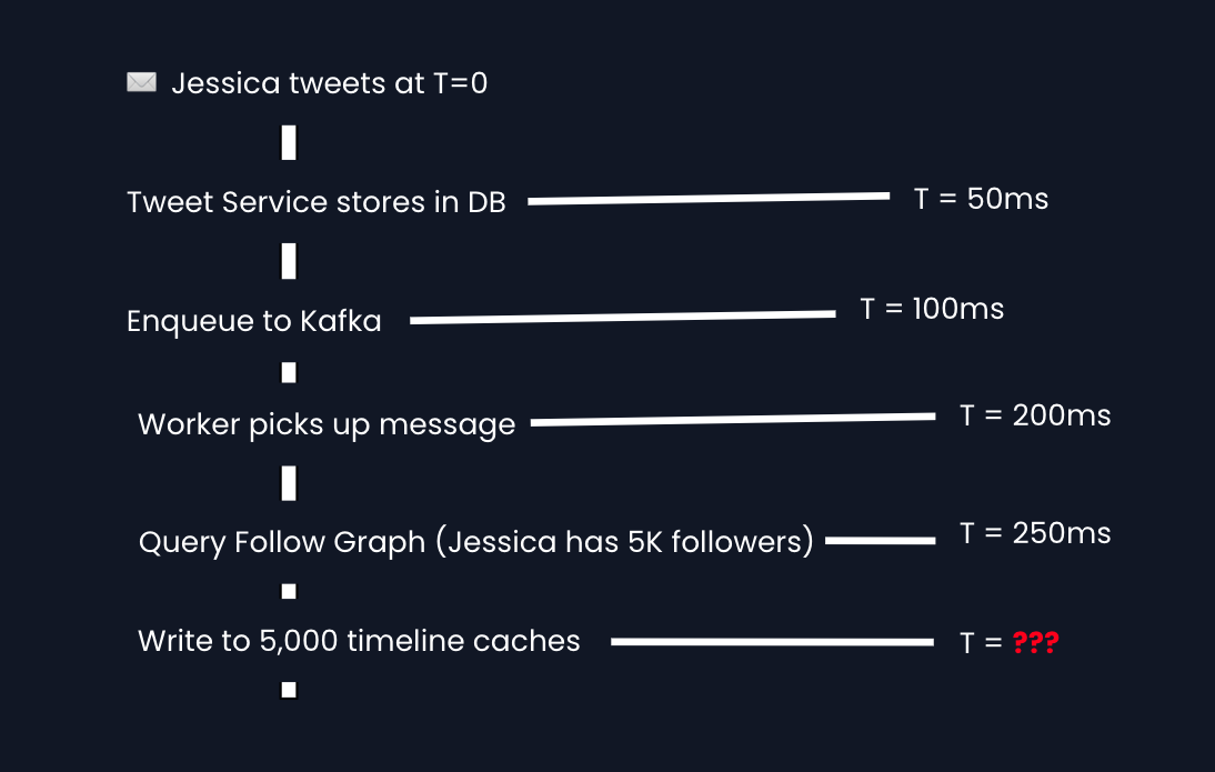 Right now, Jessica's tweet isn't confirmed until ALL her followers' timelines are updated.