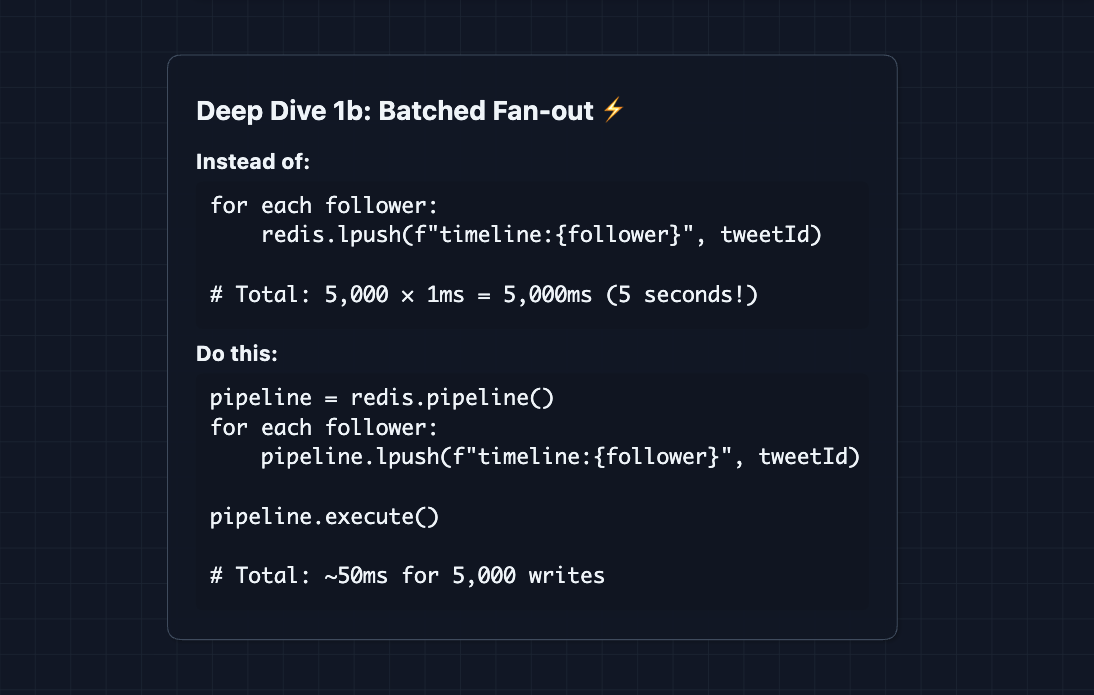 - The Twitter Bar: Complete the system for normal users and proactively dive into 2-3 deep dives: Hybrid fan-out math, thundering herd mitigation (cache stampede), or partition strategy trade-offs. You explain how we achieve < 5s delivery using Redis pipelines.