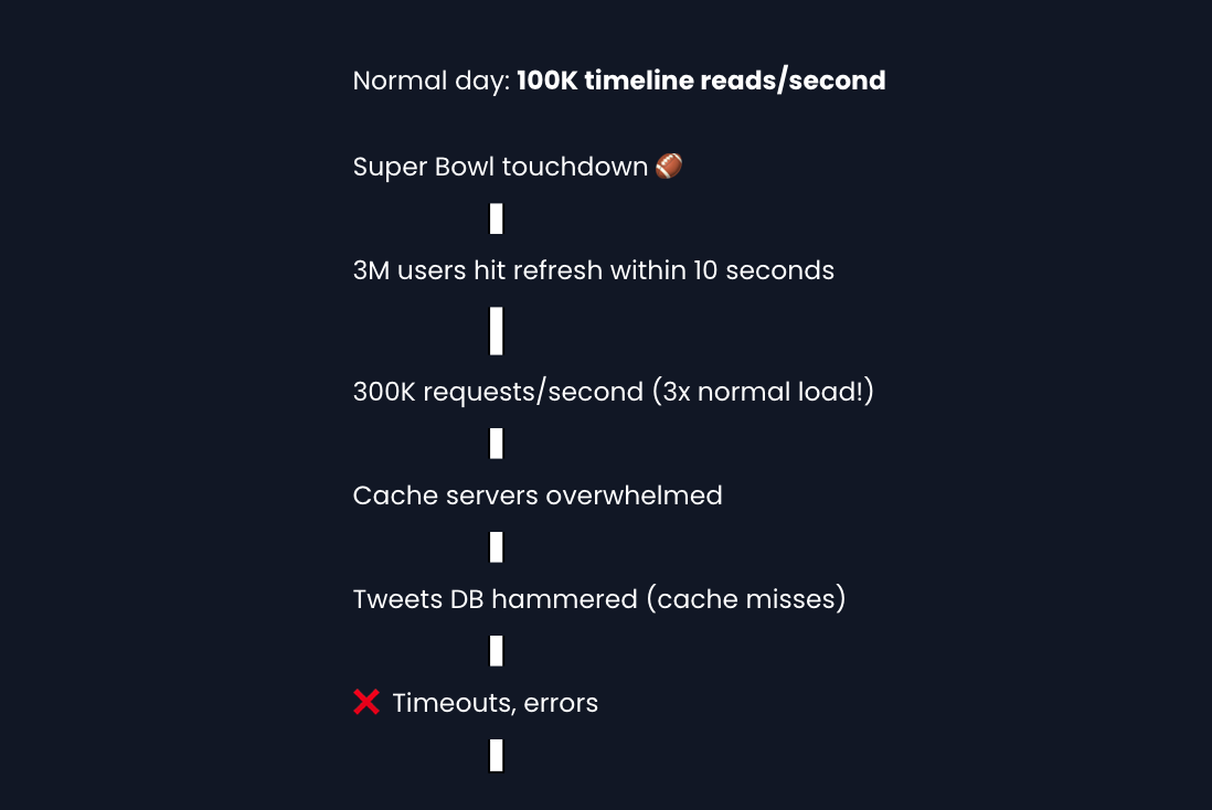 Millions of users refresh their timelines simultaneously. This is the thundering herd problem.