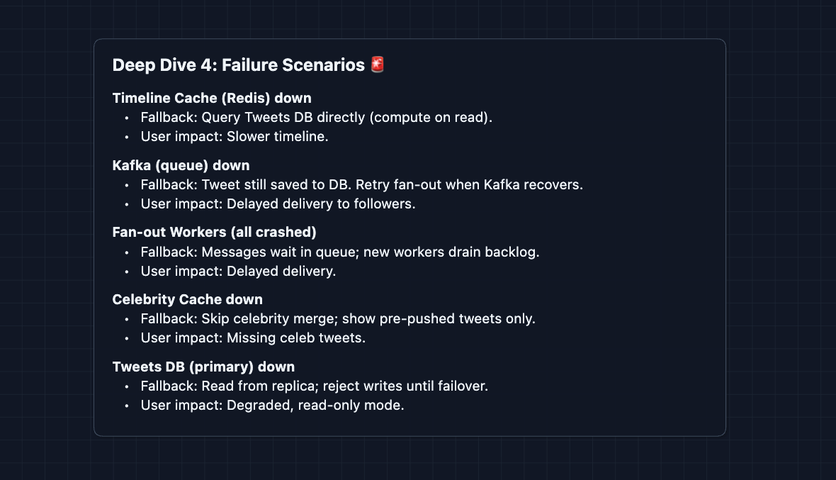 - Be ready for "why Kafka?" It's for durability, decoupling, and async processing. The user doesn't wait for fan-out to complete.